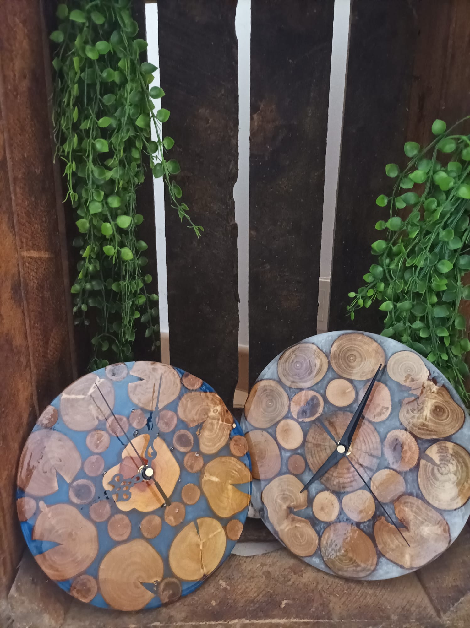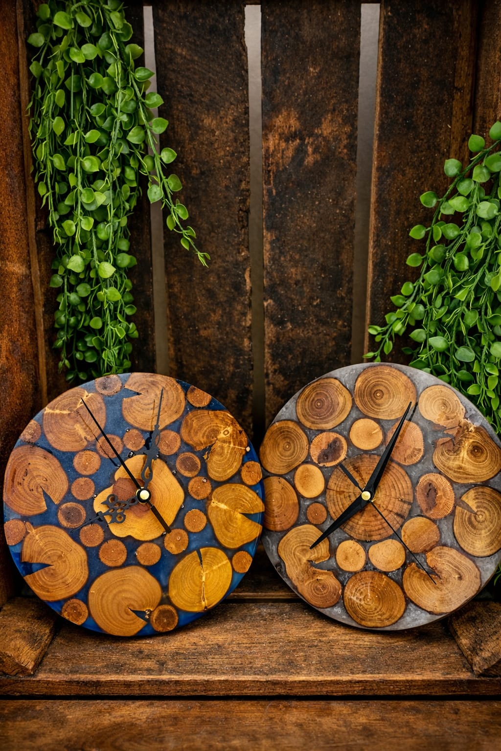 Apportez une touche naturelle et chaleureuse à votre intérieur avec cette pendule murale faite main, réalisée à partir de tranches de bois massif soigneusement sélectionnées et incrustées dans une base en résine.